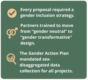 From the earliest funding stages, all partners had to demonstrate how their projects integrated gender equity and social inclusion. The Platform prioritized those showing clear commitments to gender inclusion for support. Then, insights from data and vulnerability assessments informed the development of community-led projects designed to promote inclusion and empower women.